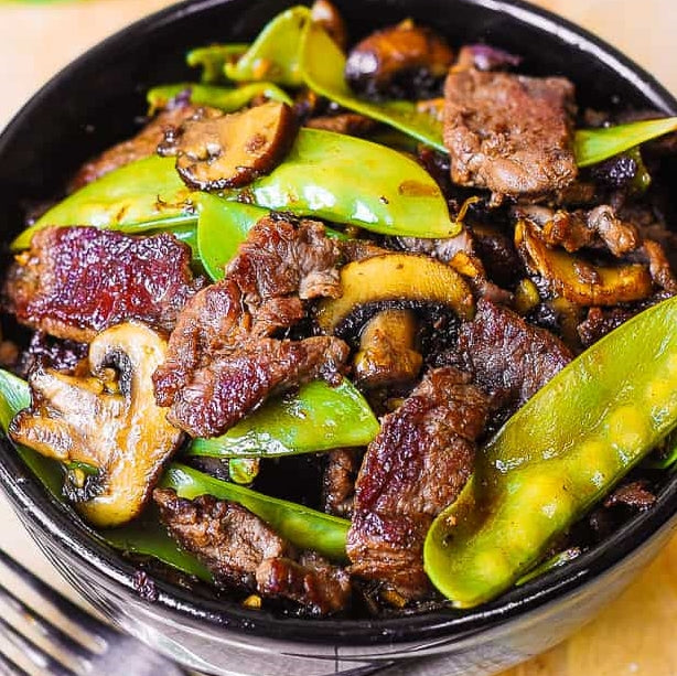 A simple dinner perfect for those busy weeknights. Your family will love tender mushrooms, crisp snow peas and thinly sliced sirloin steak sautéed with garlic.