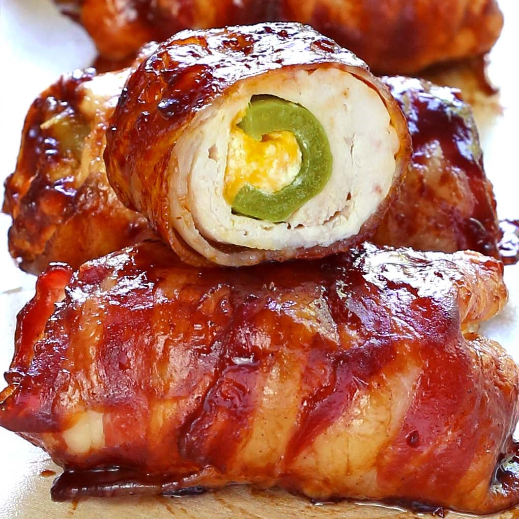 Fill each jalapeno half with about 1 tbsp or little more of cheese mixture. Place filled jalapeno half, cheese side down on chicken fillets and roll chicken around jalapeno.