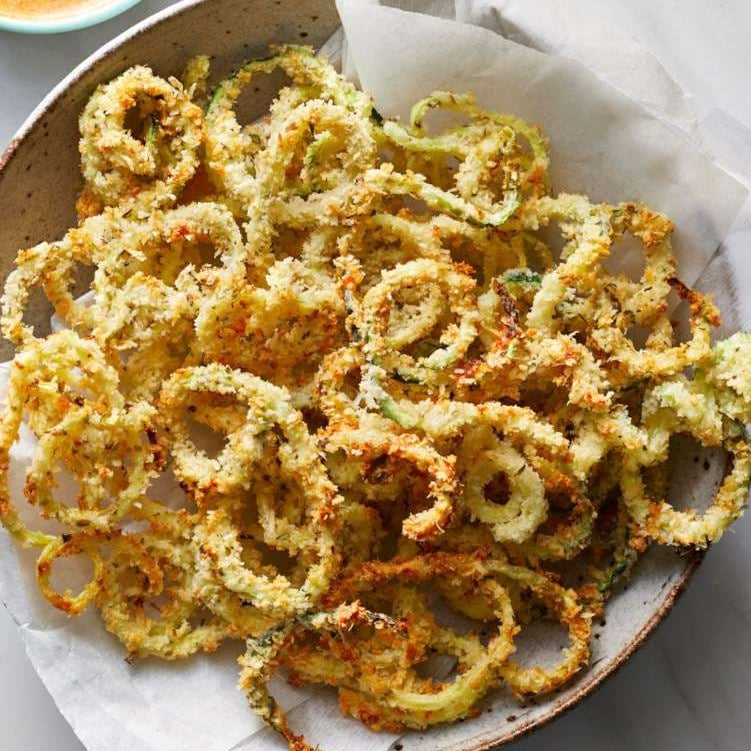 Coarsely chop zucchini noodles into 14-15 cm pieces. Working in batches, dredge the noodles in the cornflour then shake off excess. Dredge in the egg whites then shake off excess. Dredge in the panko mixture then shake off excess. Arrange the noodles, well spaced apart, in a single layer on the baking trays. Coat with cooking spray.