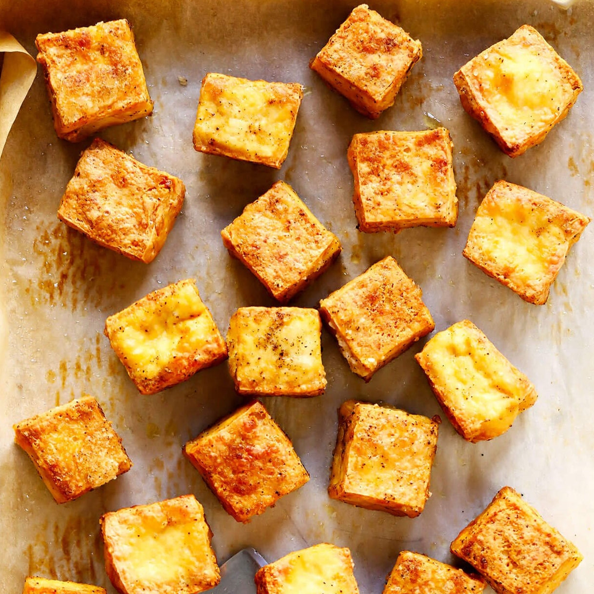 Turn the tofu out onto a baking paper-covered baking tray, and arrange it so that it is in an even layer. (not touching)