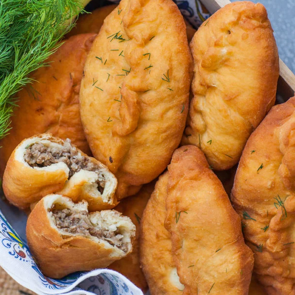 A traditional Russian Piroshki with a juicy and flavourful beef and cheese filling.
