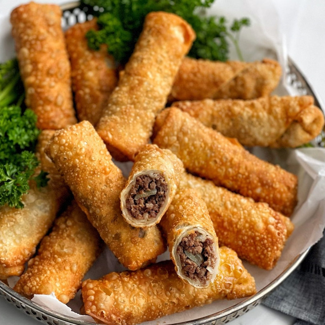 Crispy fried egg rolls stuffed with ground beef, cabbage and delicious seasonings. A creation that goes well with any Chinese dish. The sherry makes it even better.