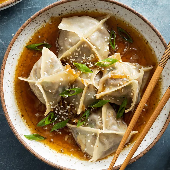 This is a flavour-packed recipe of ground beef and mushroom-filled dumplings in a savoury broth. Top with a drizzle of sesame oil, spring onions, and sesame seeds for an extra burst of flavour.