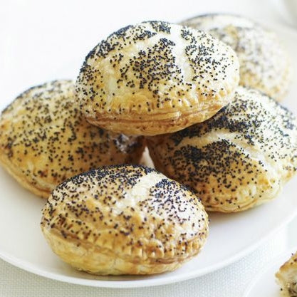 Using an 11.5 cm cutter, cut 24 rounds from pastry sheets. Spoon 2 tablespoons of mince mixture into centre of 1 pastry round. Top with 2 teaspoons of feta. Brush edge with egg. Top with 1 pastry round. Press edges of pastry together, brush with egg. Sprinkle with poppy seeds. Place on tray and repeat.
