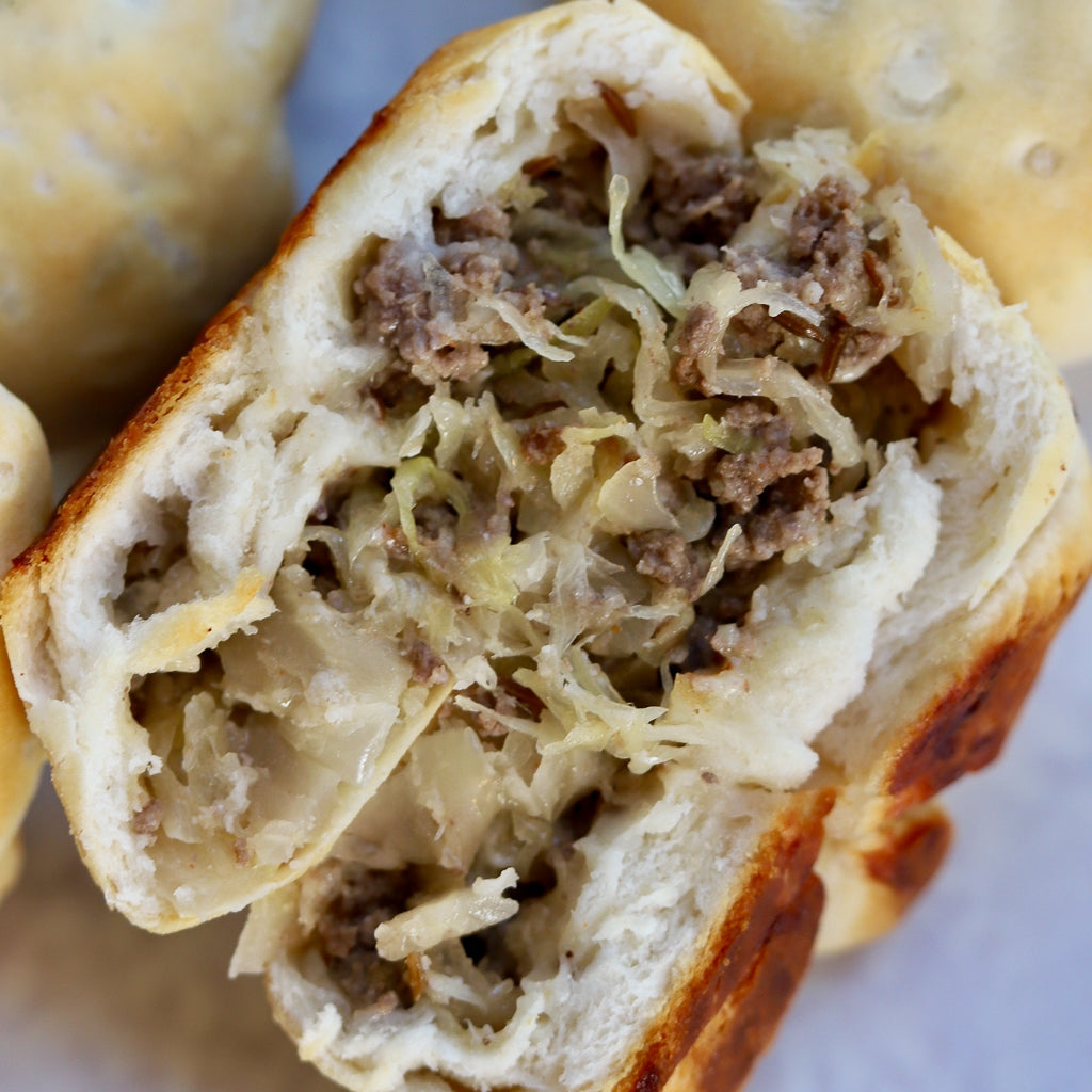 Ground beef and cabbage wrapped in dough, this is a close relative to a hamburger of German and Russian descent.
