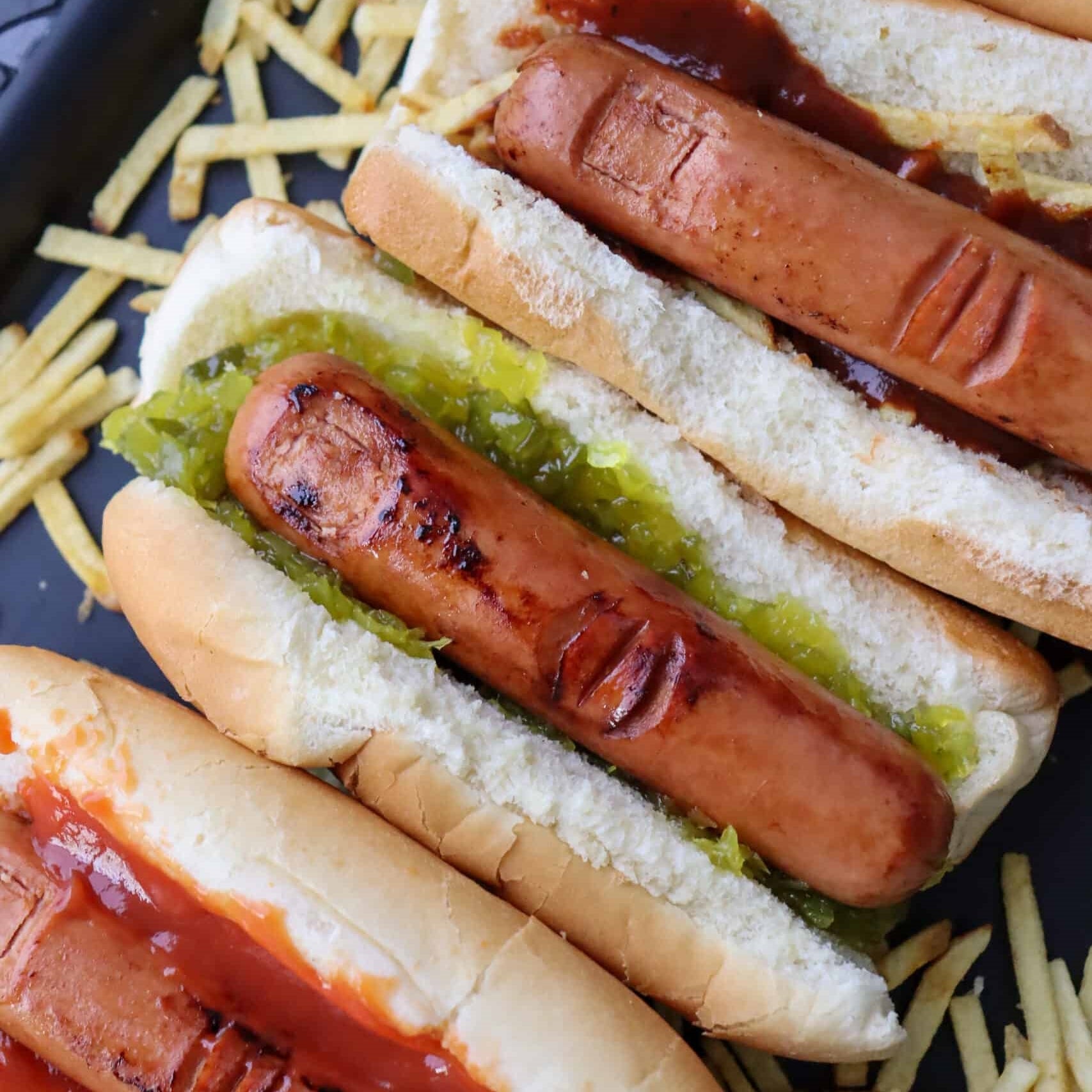 At this point, spray a large frying pan with non stick cooking oil and set your stove top to medium high. Place your hot dogs in the frying pan and cook them until all sides of the hot dogs are cooked and slightly golden.
