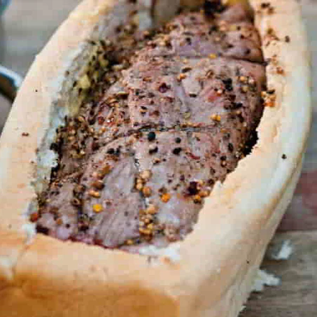 When you take it off the braai, the bread should be toasty and when you cut it open, the fillet should be medium rare. If the bread isn’t toasty enough, remove the foil and let it bake on the open coals, like you would do with braai broodjies, turning it every now and then until nice and toasty.