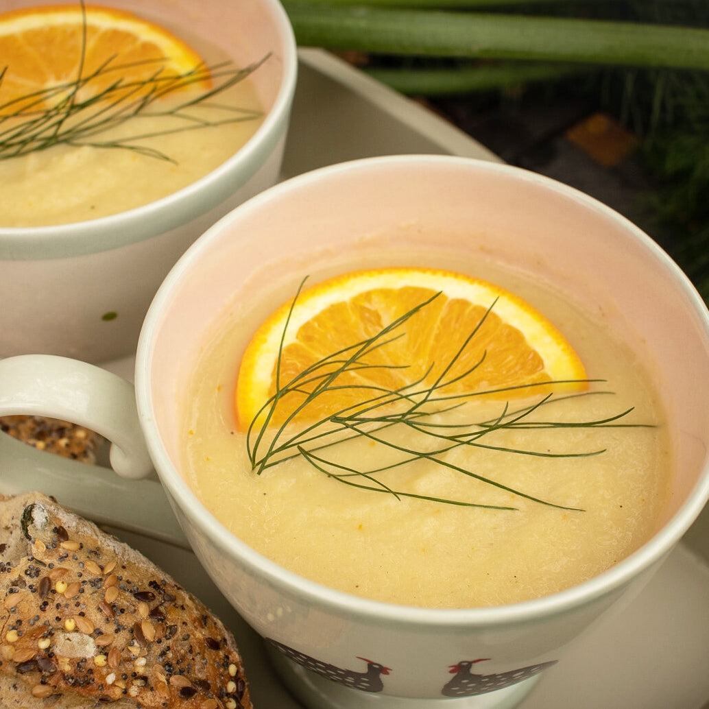 Heat the oil in a large saucepan and sauté onion, garlic, celery and thyme for 10 minutes. Add celeriac and apple then fry another 2-3 minutes. Add stock, ½ the orange zest and all the orange juice and simmer for 30 minutes until celeriac is tender. Remove from heat and purée until smooth. Stir in remaining zest, taste and season with SIDS SALT & PEPPER. Purée again then keep hot until serving.