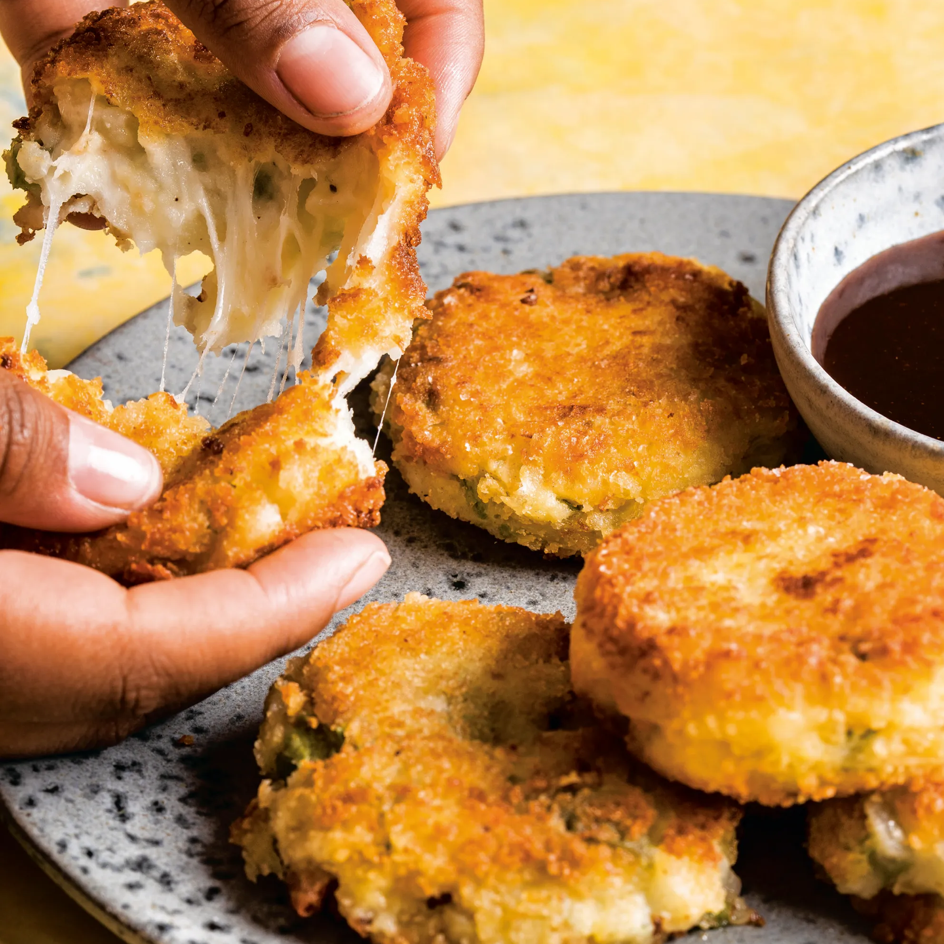 Deep fried and panko coated potato croquettes filled with gooey cheese.