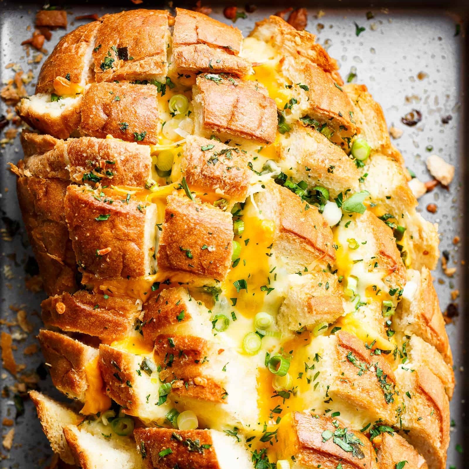 If you’re looking for an easy appetiser for entertaining your family or friends, look no further than this a Bloomin’ Onion Garlic Bread. (or Pull Apart Bread) Ultra cheesy with two types of cheese baked between wedges of fresh bread.