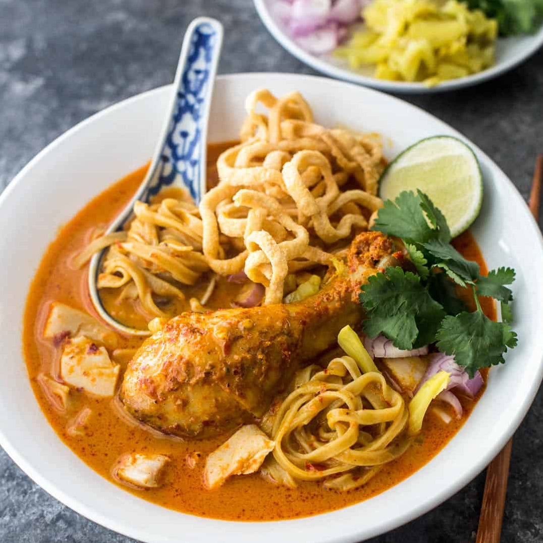 This creamy, tangy curry from the highlands of Thailand, is topped with pickled shallots and crispy noodles.