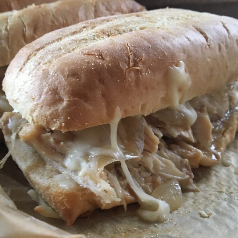TO SERVE: Shred chicken. Toast baps until golden. Place some shredded chicken on the bottom and top with a slice of Havarti cheese. Spoon off fat or use fat separator on liquids left in crock pot. Serve this “jus” into small bowls and serve with each sandwich for dipping.