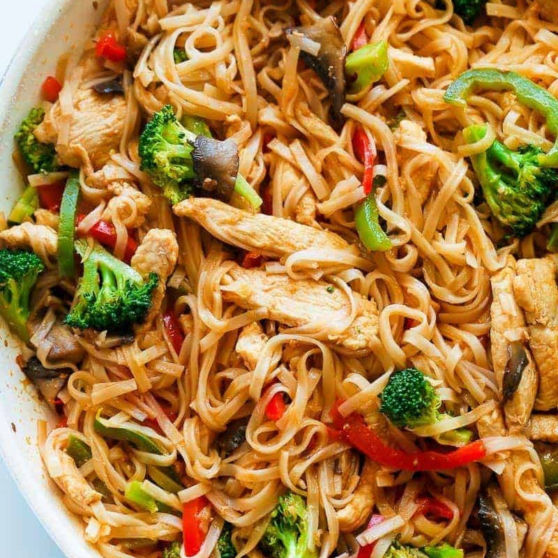 Cook noodles as per packet. Drain and discard marinade from the chicken. Stirfry chicken in 2 tsp oil for about 30 seconds then drain and keep warm. Stirfry broccoli in the remaining oil for 5 minutes then add onions and garlic. Stirfry a further 3-5 minutes until broccoli is tender. Return chicken and reserved broth to wok to boil for 2 minutes until thickened. Toss in noodles and stir. Serve with a garnish of peanuts.