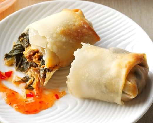 Preheat oven to 220°C. Combine greens, pork, cream cheese, onion, SIDS SALT & PEPPER and seasonings until well blended. With 1 corner of an egg roll wrapper facing you, place ¼ cup pork filling just below centre of wrapper. (Cover remaining wrappers with a damp paper towel until ready to use) Fold bottom corner over filling then moisten remaining wrapper edges with water. Fold side corners toward centre over filling. Roll egg roll up tightly, pressing at tip to seal. Repeat until all filling is used.
