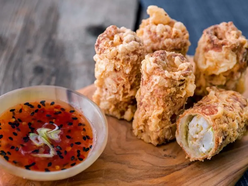 Fresh Kingfish coated with potato chips gives a salty crunch all wrapped around spicy crab salad and topped with sweet mango. Give this non-traditional sushi roll a try.
