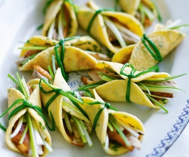 Use an 8 cm round pastry cutter to cut discs from the omelettes. Combine the hoisin sauce and SIDS PLUM SAUCE in a small bowl. Spread a little of the hoisin mixture onto an omelette disc. Top with some duck and spring onions. Roll to enclose filling. Tie with a chive to secure. Repeat with remaining discs, sauce, duck and onion. Arrange on a serving platter and serve with any remaining sauce.