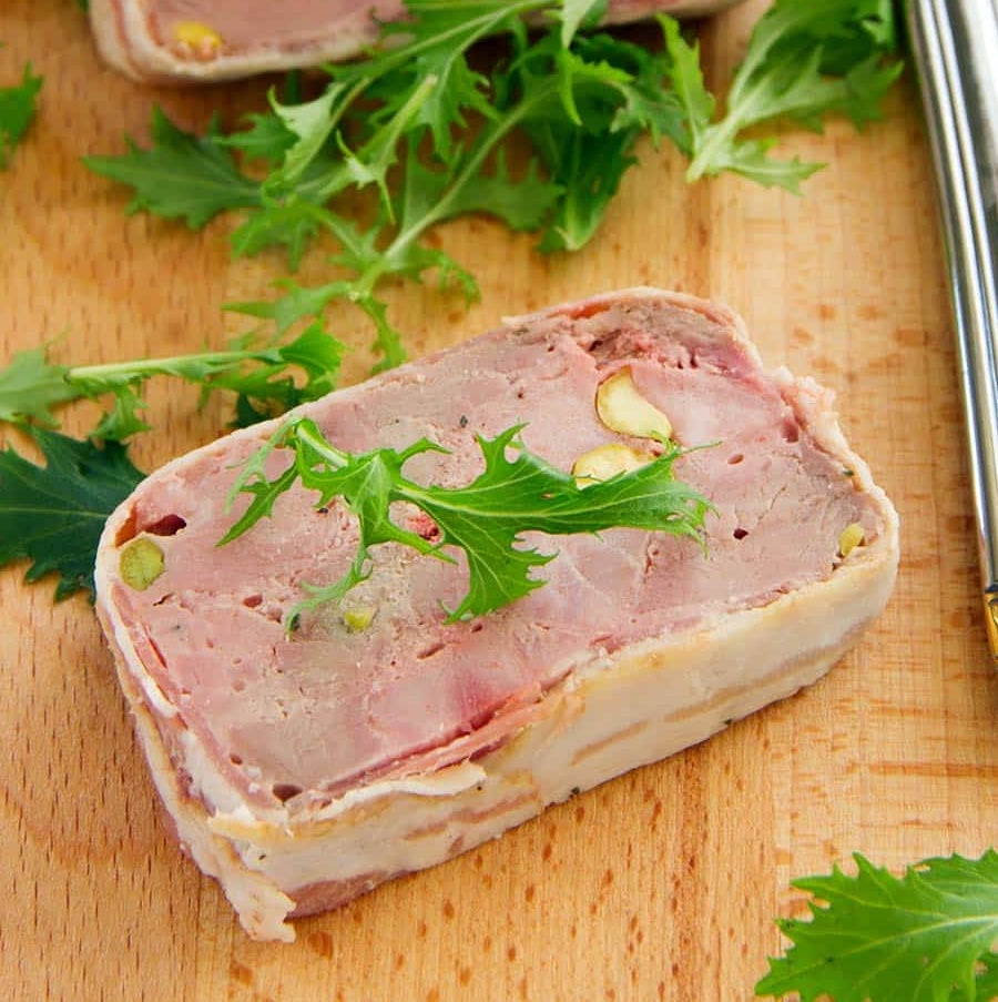 Place the terrine in a pan of hot water that comes ⅔ up the side. Cook for about 1 hour at 180°C until juices run clear when a skewer is inserted.