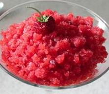 Place dish uncovered in the freezer until mixture barely begins to freeze around the edges, about 45 minutes. Mixture will still be slushy in the centre. Lightly stir the crystals from the edge of the granita mixture into the centre, using a fork and mix thoroughly. Close freezer and chill until granita is nearly frozen, 30-40 more minutes. Mix lightly with a fork as before, scraping the crystals loose. Repeat freezing and stirring with the fork 3-4 times until the granita is light, crystals are separate and granita looks dry and fluffy.