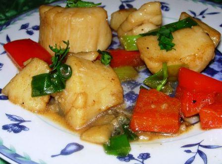 Succulent scallops are seared and then simmered with sweet orange bell pepper in a garlic sauce. This dish goes perfectly over rice or noodles.