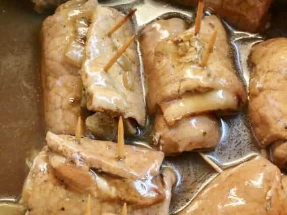 Learn how to make traditional Pork Rouladen. This German recipe is stuffed with bacon, apple, pickles, mustard and onions. Serve with gravy.