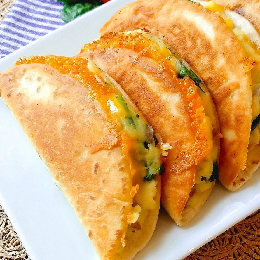 HISTORY: a Mexican dish consisting of a tortilla that is filled primarily with cheese, and sometimes meats, spices, and other fillings, and then cooked on a griddle or stove. Traditionally, a corn tortilla is used, but it can also be made with a flour tortilla.