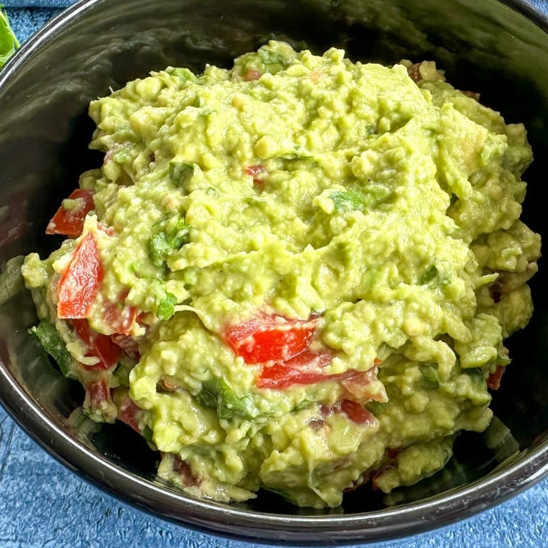 During the resting time, prepare the avocados, cut in half, remove the pit and scoop from the outer rind. For smooth guacamole, put the flesh into a food processor and pulse until smooth. For chunky guacamole, use an old fashioned potato smasher and smash until you reach the desired consistency.