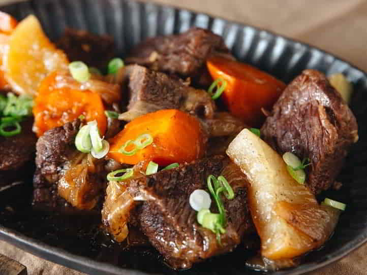Boneless short ribs are cooked with daikon and carrots in a savoury sauce until moist and tender. A beautiful dinner that gets done in 30 minutes.