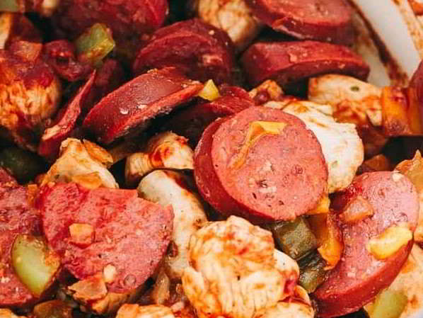 Easy, tasty, one pot recipe for Jambalaya prepared with rice, chicken, shrimp and sausages.