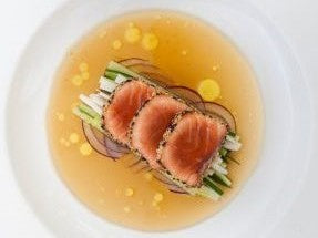 Slice the salmon into thin even pieces and present on top of the salad, then finish with some of the ginger glaze.