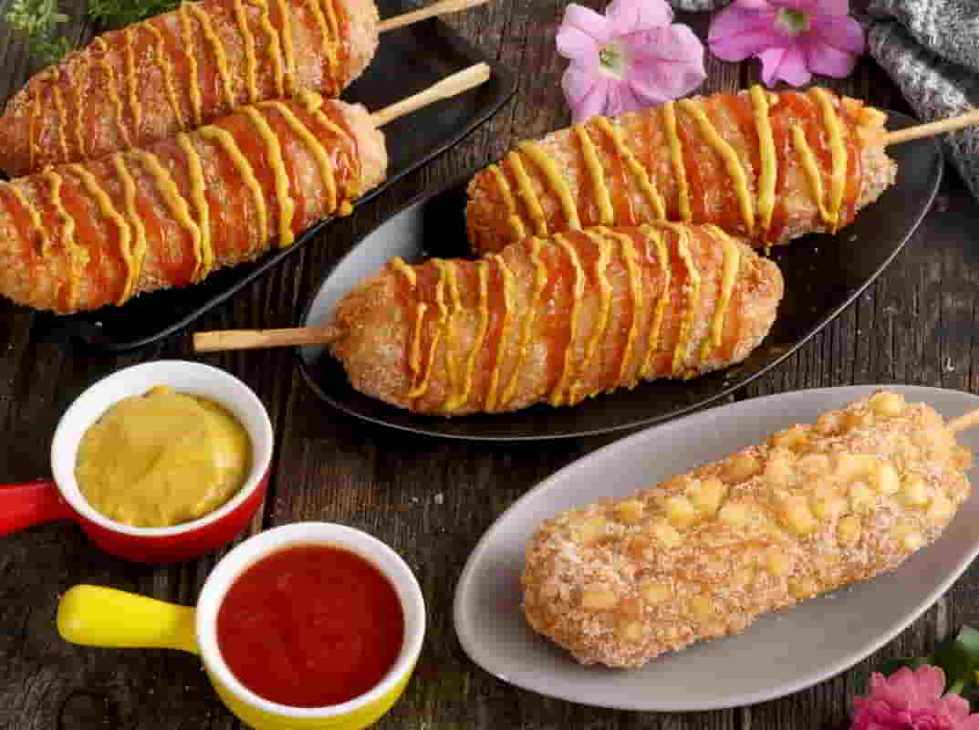 Made of sausages on a stick coated in yeasted batter with french-fry bits and breadcrumbs. Deep-fried then drizzled with sugar, Tuimato sauce, and mustard for a sweet, tangy, savoury finish.