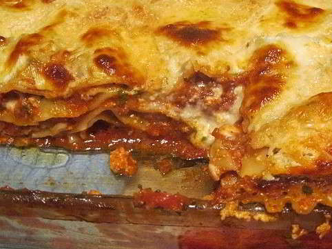 To assemble, spread 1½ cups of meat sauce in the bottom of a 23x33 cm baking dish. Arrange 6 noodles lengthwise over meat sauce. Spread with ½ of the ricotta cheese mixture. Top with ⅓ of mozzarella cheese slices. Spoon 1½ cups meat sauce over mozzarella, and sprinkle with ¼ cup Parmesan cheese. Repeat layers, and top with remaining mozzarella and Parmesan cheese. Cover with foil: to prevent sticking, either spray foil with cooking spray, or make sure the foil does not touch the cheese.