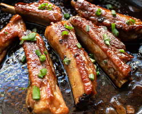 In a large nonstick deep frypan, heat oil on medium-high. Pan-fry the ribs until caramelized and golden brown on all sides.