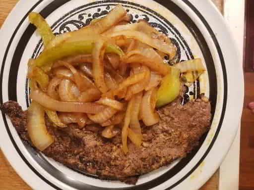 Melt remaining 2 tablespoons of butter in the same pan, increase heat to medium-high and fry coated liver slices until lightly browned, about 3 - 4 minutes on each side. Return onions to the pan and reduce heat to medium. Continue to cook until onions are heated through and liver is slightly pink inside, or longer to suit your taste.