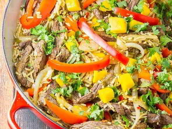 Add rice, stir, cover and cook until most the water is absorbed and rice is cooked through, stirring occasionally, 7-10 minutes. Toss in mango and coriander to warm. Serve immediately as a pan meal, or serve in flour tortillas with sour cream.