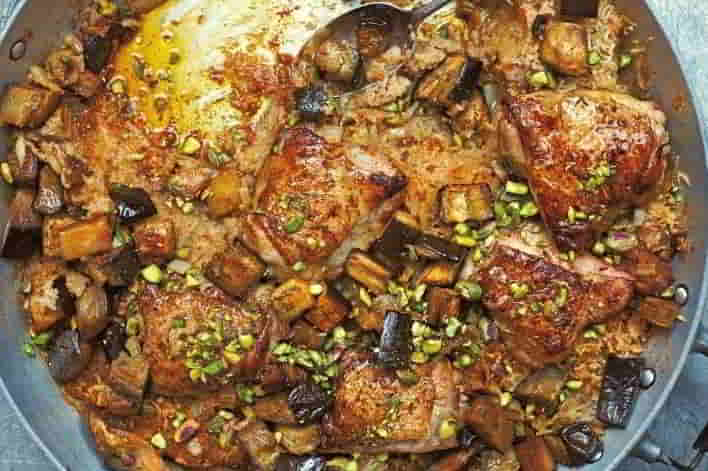 Drizzle in the oil. Cook in the oven, uncovered, for 40 minutes. The top should be golden and the chicken cooked through. Sprinkle on the pistachio nuts and serve with a green salad.