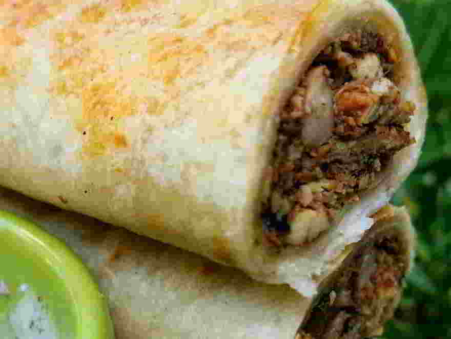 Spread between ⅓-½ cup of chicken filling along the longest length of your tortilla in a horizontal line, starting 1 cm up from the bottom. Make sure your filling is spread evenly across, then bring the bottom edge of the tortilla up over the filling and wrap tightly. Place the rolled tortilla seam side down on the baking tray. Continue this process until you have finished your chicken filling.