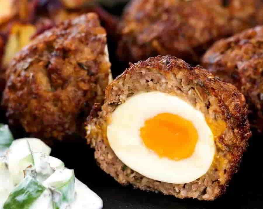 The Indian origins of the ever-popular British Scotch egg, this version wraps spiced beef around a jammy yoke of a boiled egg.