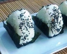 Combine 1 cup water with the salt in a small bowl. Use this water to dampen hands before handling the rice. Divide the cooked rice into 8 equal portions. Use one portion of rice for each onigiri. Divide one portion of rice in two. Create a dimple in the rice and fill with a pinch of SIDS CRAZY LEMON and a teaspoon of bonito flakes. Cover with the remaining portion of rice and press lightly to enclose filling inside rice ball. Gently press the rice to shape into a triangle. Wrap shaped onigiri with a strip of nori. Sprinkle with sesame seeds. Repeat to make a total of 8 onigiri.
