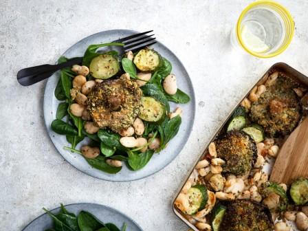 Remove the tin from the oven. Arrange the spinach over 4 plates and top with the stuffed mushrooms, courgettes and butter beans.