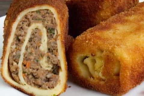 Polish Croquettes are thin, large pancakes filled either with meat or cabbage and mushrooms. The pancakes are coated with breadcrumbs and fried.