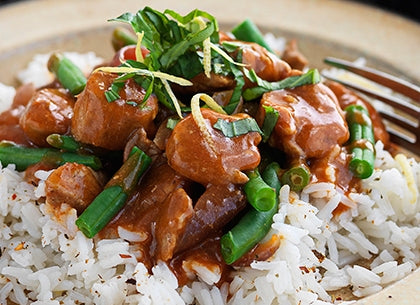 Heat the oil in a heavy-based saucepan and sauté the onion, pork and red curry paste for 3-4 minutes until just coloured.