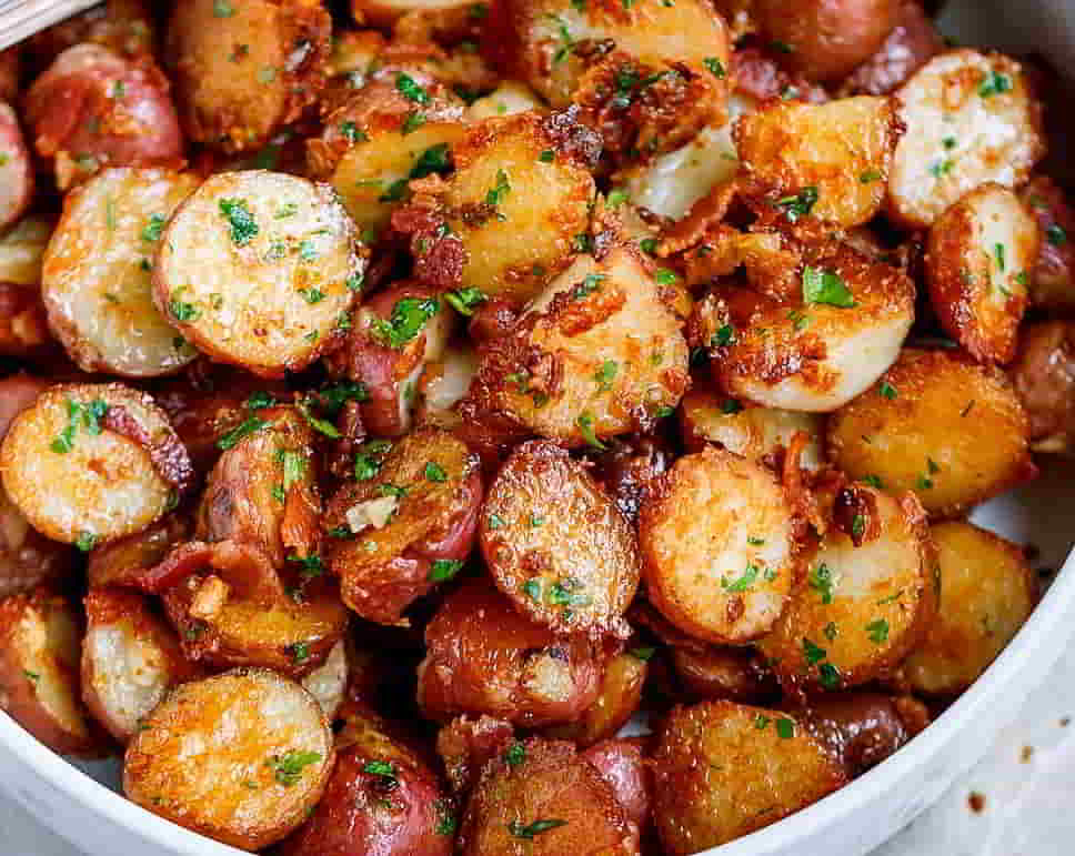 These potatoes are crispy and golden on the outside and fluffy on the inside. Baby roasted potatoes are seasoned with garlic, herbs, butter, bacon, parmesan, then baked to crisp perfection.