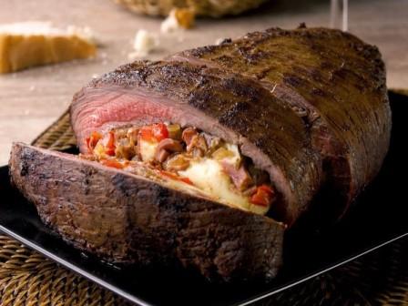 Use a sharp knife to cut off a thin slice from the larger side of the rump cap. Next, cut a deep pocket into the meat as in the image above. Carefully roll the pocket inside out, making sure the rump cap doesn't get torn in the process. Chop up the onions, capsicum and bacon then fry them in a pan. Transfer the contents of the pan into a bowl containing diced mozzarella and stir everything together with the oregano.