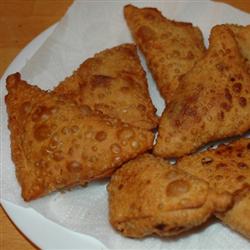 Divide dough into 15 equal portions and roll into balls then flatten into 10 cm circles. Cut each circle in half, dampen edges and form into cones. Fill with equal portions of meat mixture, dampen top and bottom edges, then pinch to seal.