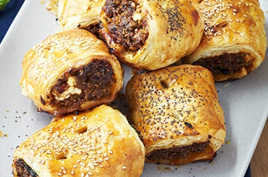 Arrange ⅓ of the mince filling in a neat log down the middle, lengthways, of one of the pastry sheets. Fold up both sides of the pastry snugly to meet on top, trim with a 2 cm overlap and brush egg wash on both parts where the pastry joins. Press to seal then cut the rolls into quarters with a sharp knife and place, seam side down, on the baking tray. Repeat with remaining pastry and mince. Brush the rolls all over with egg wash then sprinkle with seeds.