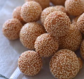 Slightly roll in your hands to make a ball shape and then roll in a bowl of sesame seeds to coat thoroughly. Set aside for frying.