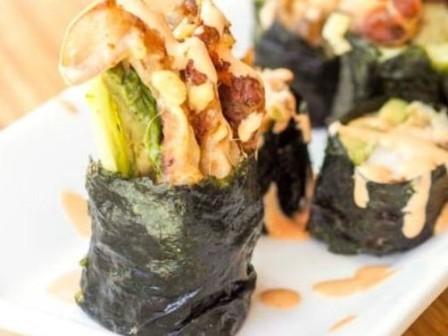 If you have a bamboo sushi rolling mat, cover it in plastic wrap and use that to make the rolls, placing the seaweed sheet on top, layering the ingredients and then rolling away from you, holding the roll tightly together.