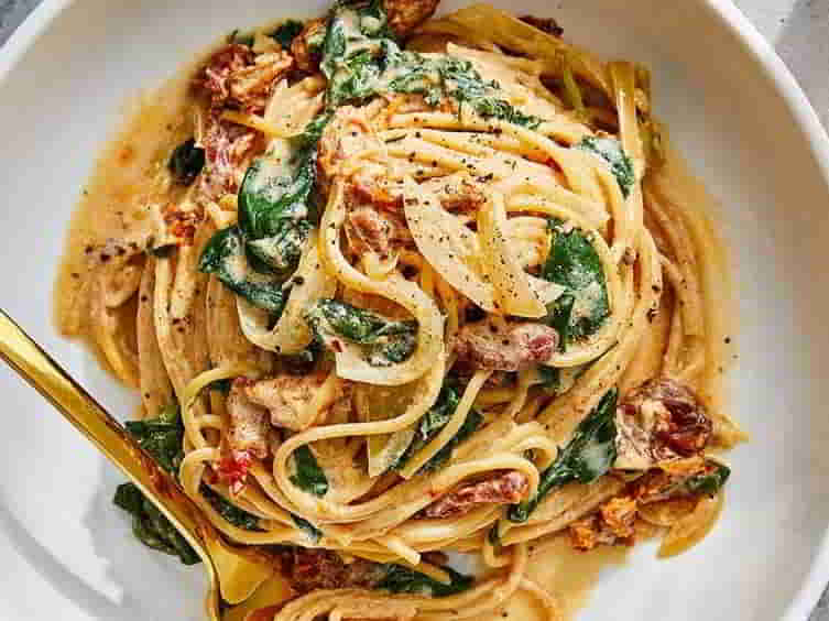 To achieve flavour quickly, we use the oil from sun-dried tomatoes to create the base of the cream sauce. The residual heat of the pasta wilts the spinach in record time for a fast weeknight dinner.