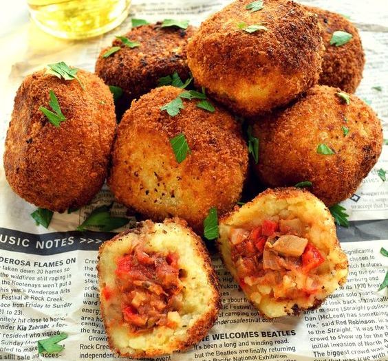 Take a small handful of mashed potatoes and flatten it in the palm of your hand. Place about a teaspoonful of the mushroom filling in the centre and close the mashed potatoes around it, forming a ball. The bomba should be between the size of a golf ball and tennis ball. Continue forming all the bombas in this way.