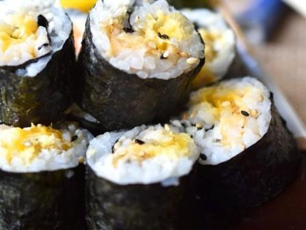 Lay 1 sheet of seaweed on a sushi mat. Wetting your hands in a dish of warm water, begin to press a thin layer of rice onto the seaweed, starting at the edge nearest you and stopping 2 cm from the far edge.